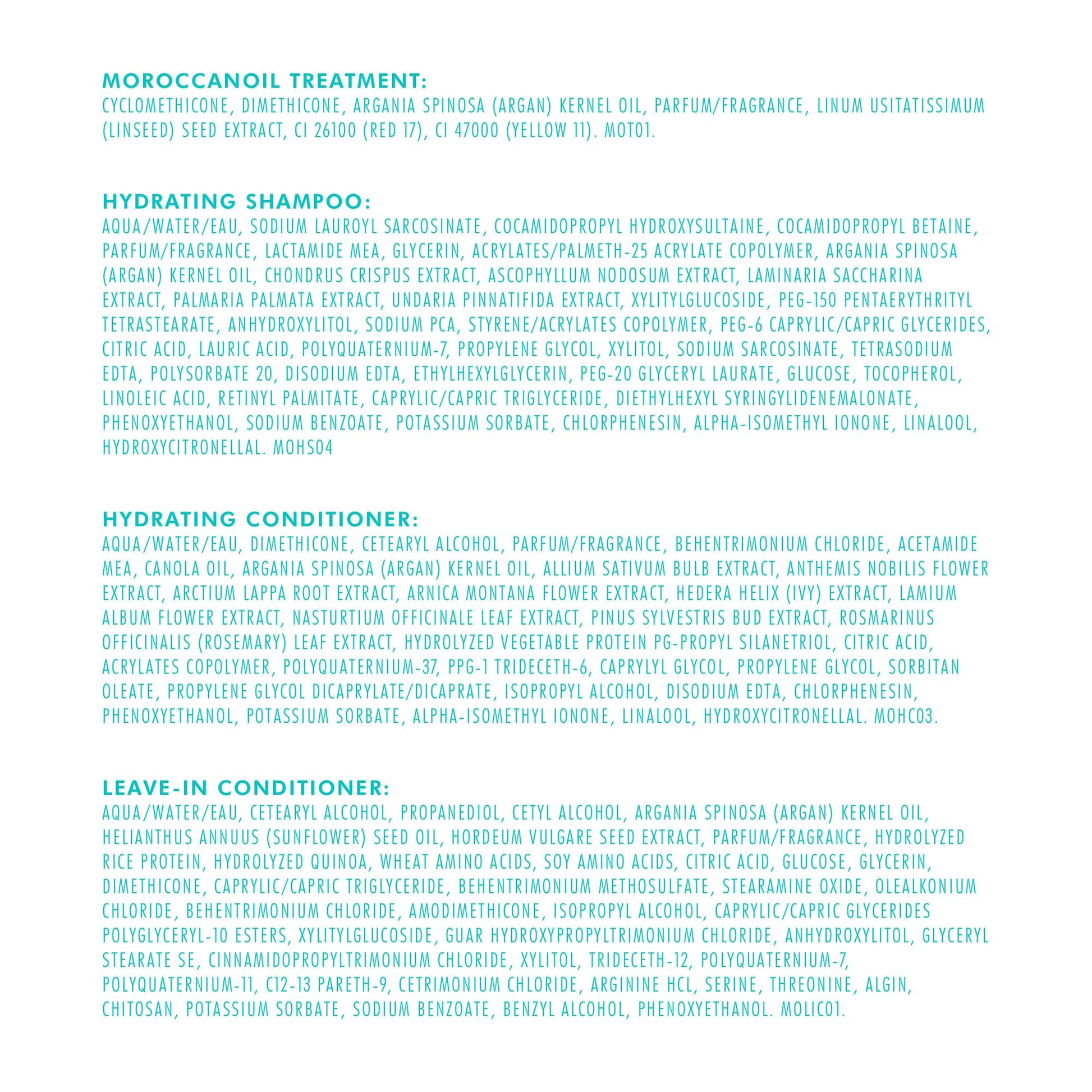 Details: Hydrating Shampoo and Conditioner deliver optimal hydration with argan oil, vitamins A and E, and moisturizing red algae. Moroccanoil Treatment detangles, speeds up drying time and boosts shine—leaving you with nourished, manageable, and smooth hair. All in One Leave-in Conditioner instantly detangles and preps hair for effortless styling.